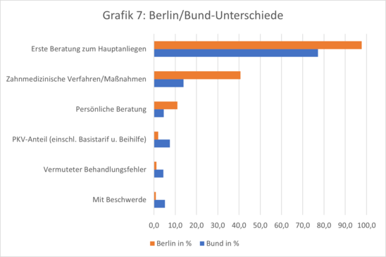 Umgekehrt ist der prozentuale Anteil der kontaktaufnehmenden Privatversicherten in Berlin erheblich geringer als im Bundesschnitt. Das gleiche gilt für vermutete Behandlungsfehler als Grund für die Kontaktaufnahme und die Kontaktaufnahme wegen einer Beschwerde.